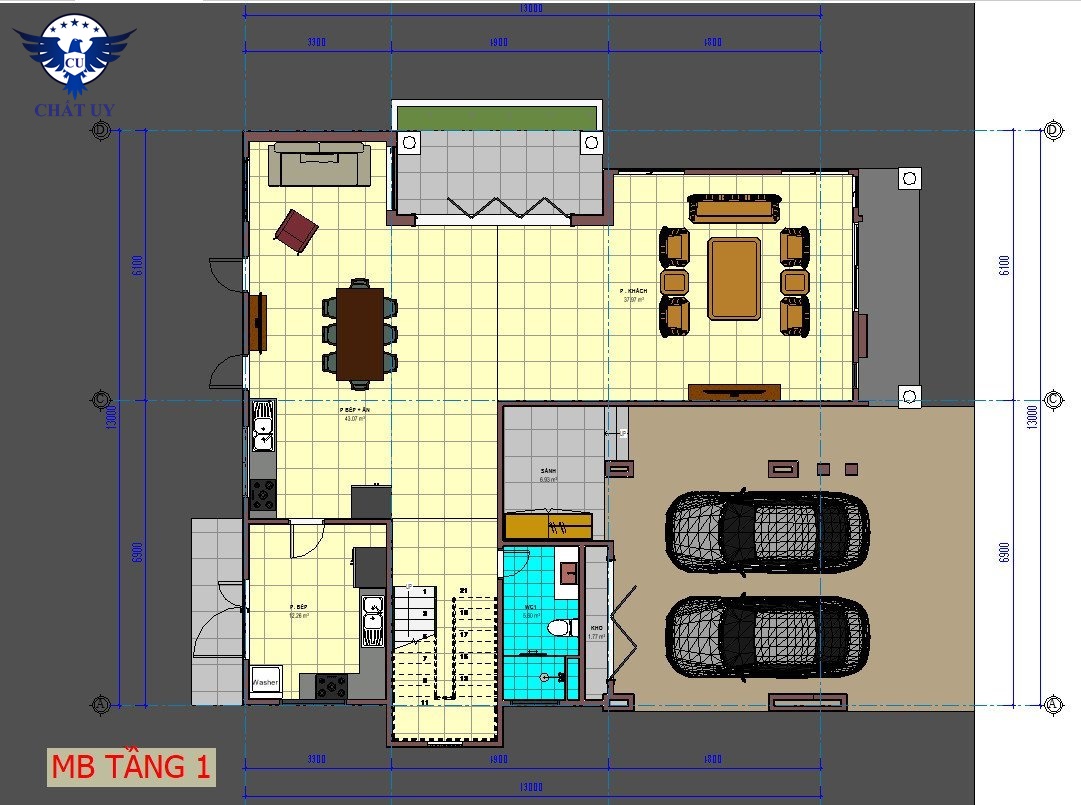 Bước và ngôi nhà là đại sảnh với không gian tầng một được thiết kế bao gồm phòng khách rộng hơn 30m2 nối thông với nhà bếp cộng phòng ăn rộng khoảng 43m2. Bên cạnh đó là một nhà vệ sinh khoảng 5m giúp các thành viên sinh hoạt một cách thuận tiện. Khu vực để xe được thiết kế rộng rãi có thể để được 2 chiếc ô tô to mà không lo về vấn đề chật hẹp.