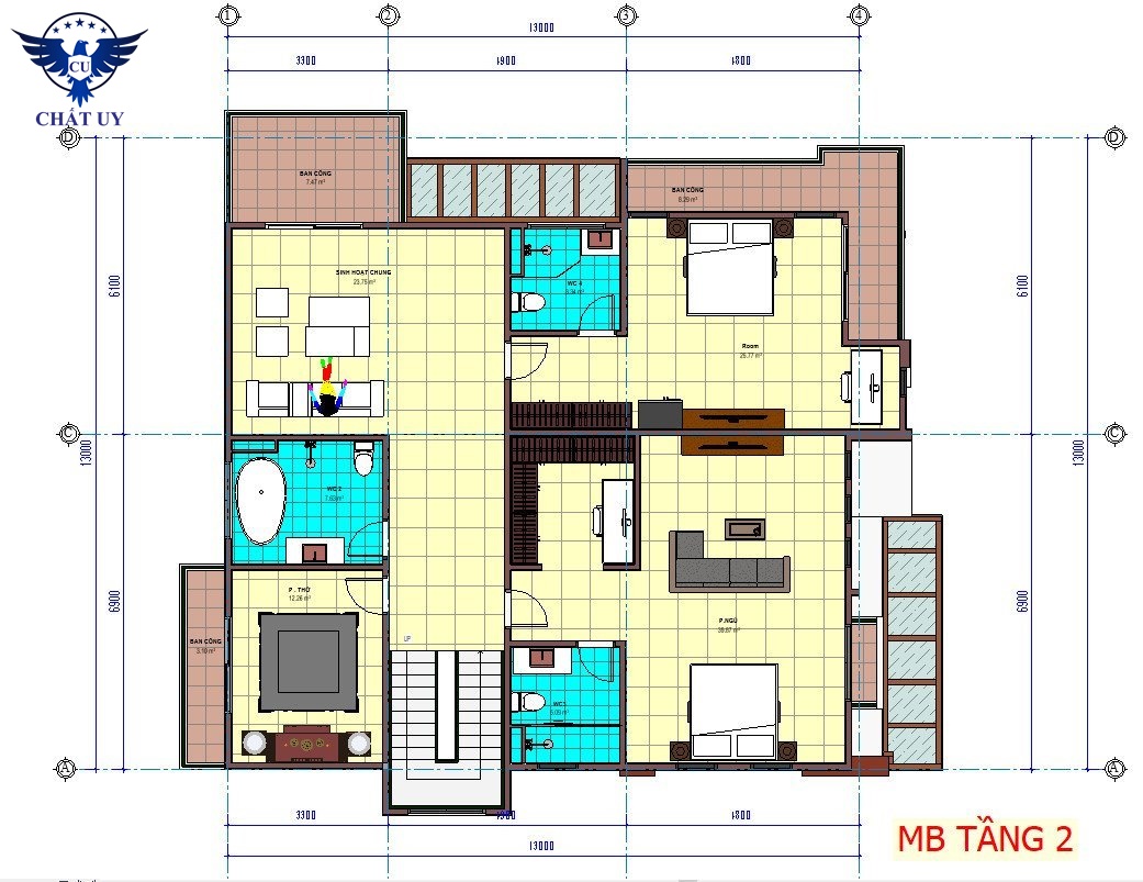 Khu vực tầng hai được bố trí gồm một phòng thờ, hai phòng ngủ, và hai nhà vệ sinh. Bên cạnh đó còn có một phòng sinh hoạt chung giúp mọi người có thể nghe nhạc, đọc sách hoặc là tụ tập sum vầy vào những dịp cuối tuần. Khu ban công được thiết kế với diện tích thoáng đãng, rộng rãi giúp bạn có thể phơi phóng quần áo một cách tinh tế mà không ảnh hưởng đến vẻ thẩm mỹ của ngôi nhà.